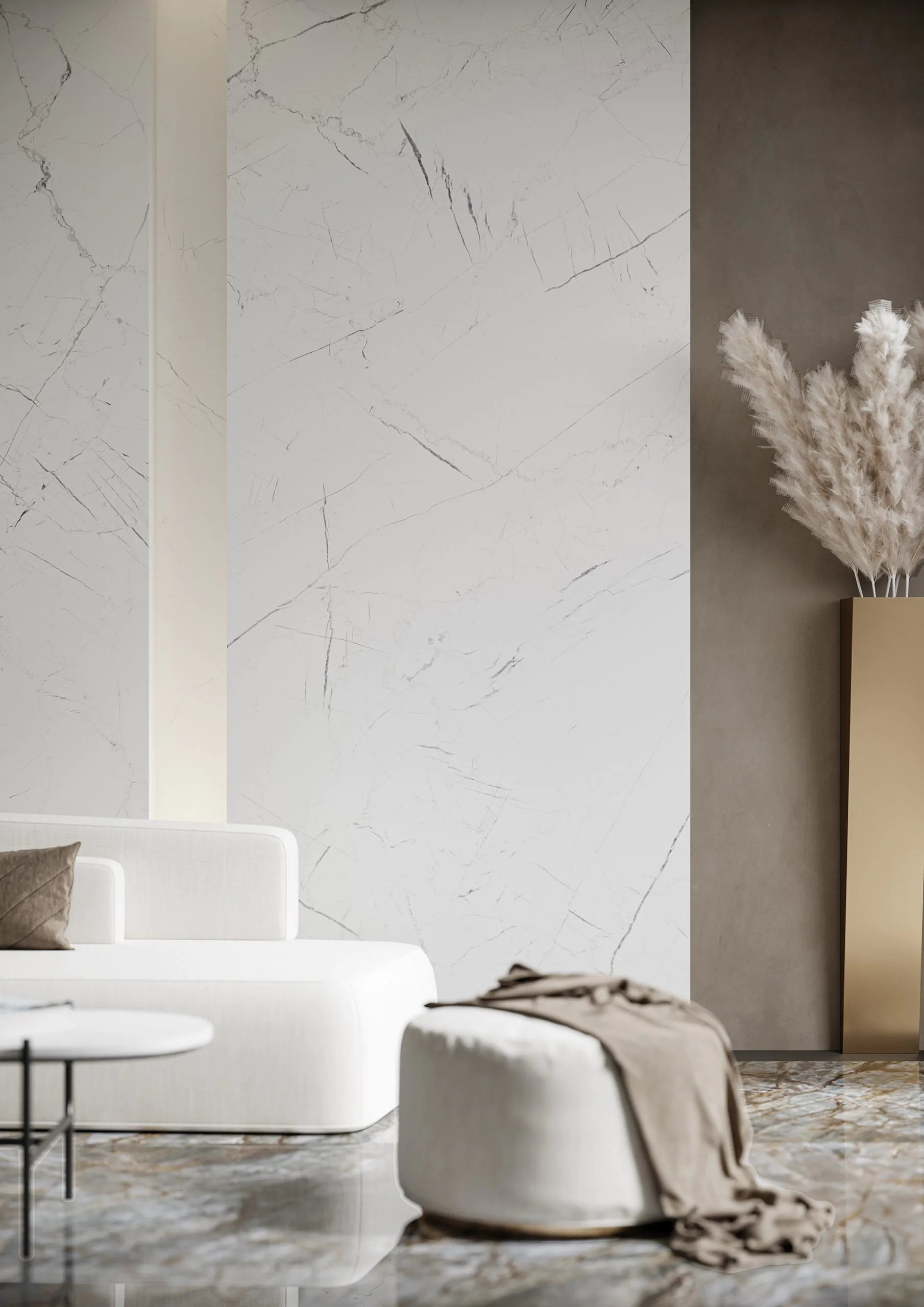 Plăcile se remarcă prin textura uniformă, tonul alb imaculat și reflexiile delicate care amplifică lumina, conferind interioarelor o atmosferă de calm, spațialitate și lux discret. Fiecare lastră devine o piesă arhitecturală, ideală pentru proiecte moderne și minimaliste, dar și pentru spații clasice unde se dorește păstrarea unui aspect atemporal.