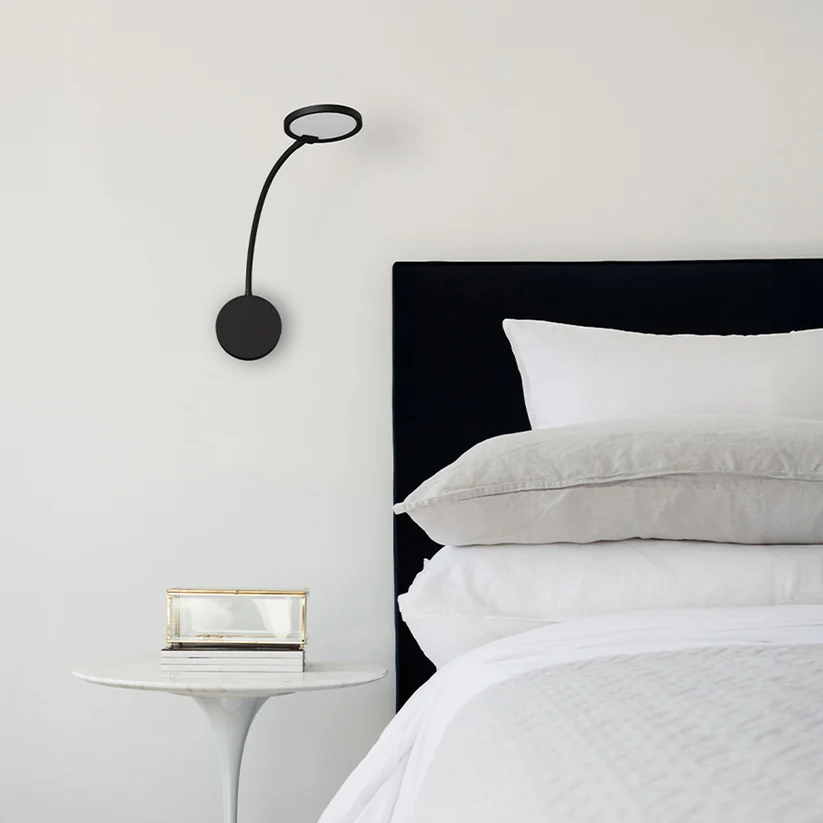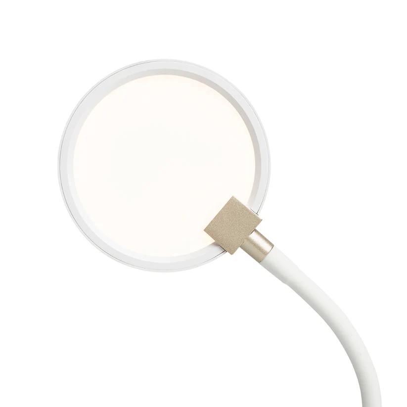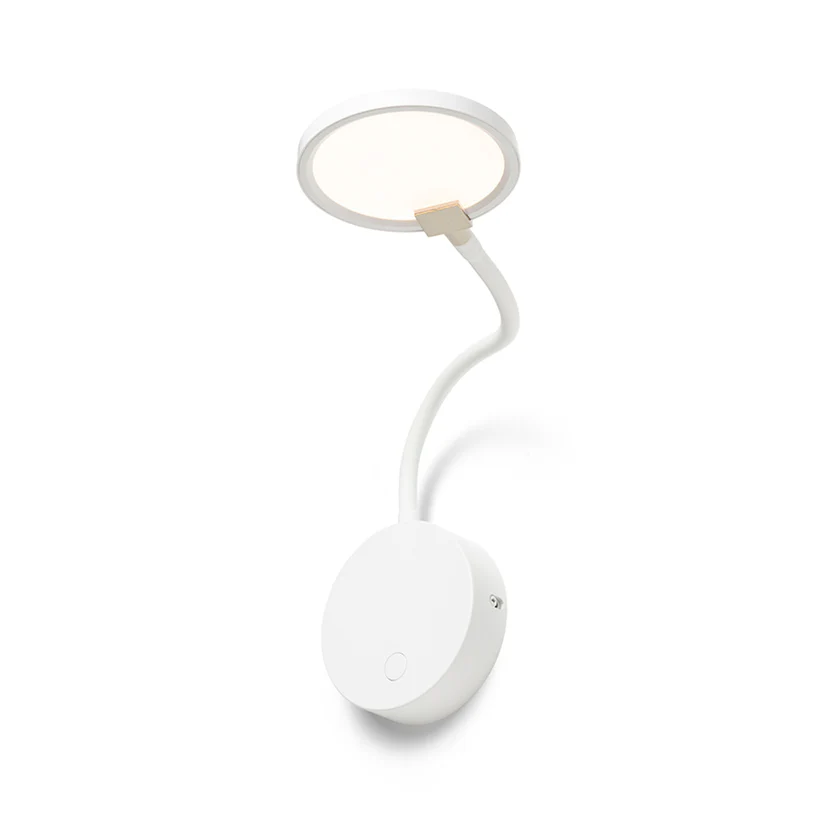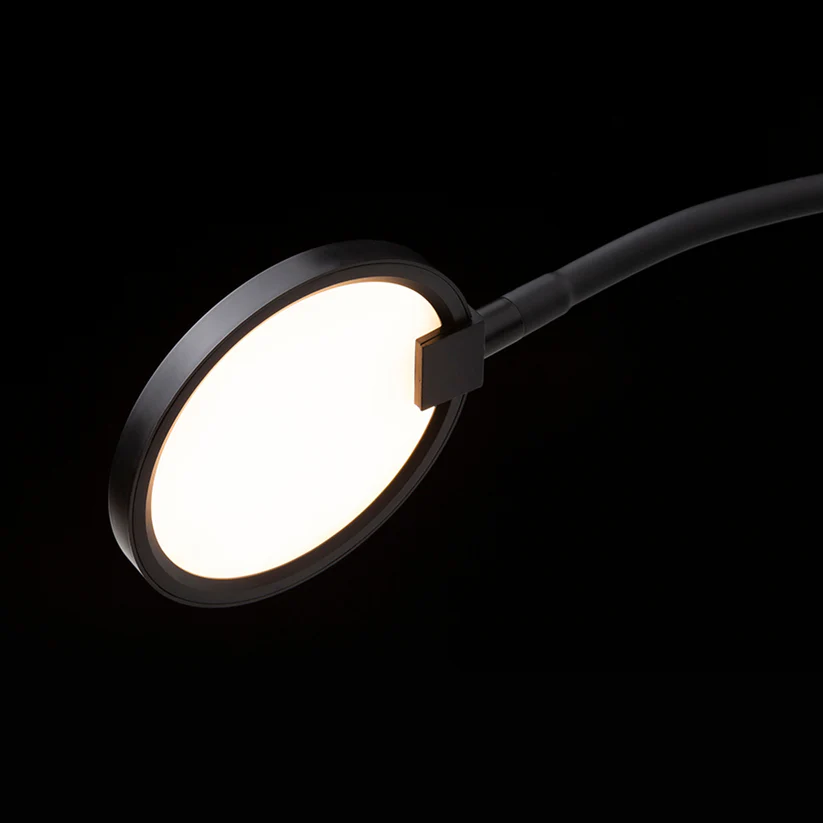 Aplica LED cu gât flexibil și reflector circular echipat cu difuzor laptos, pentru o lumină ambientală plăcută și difuză.