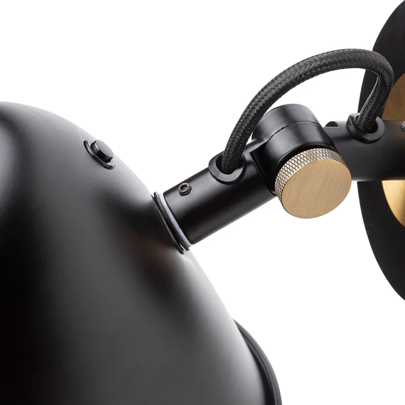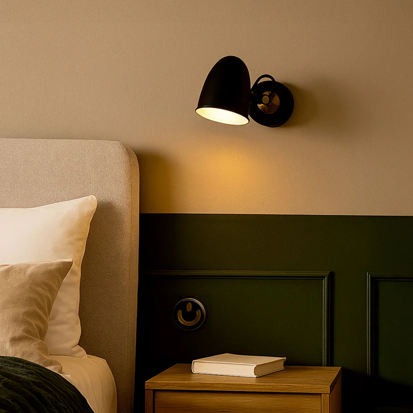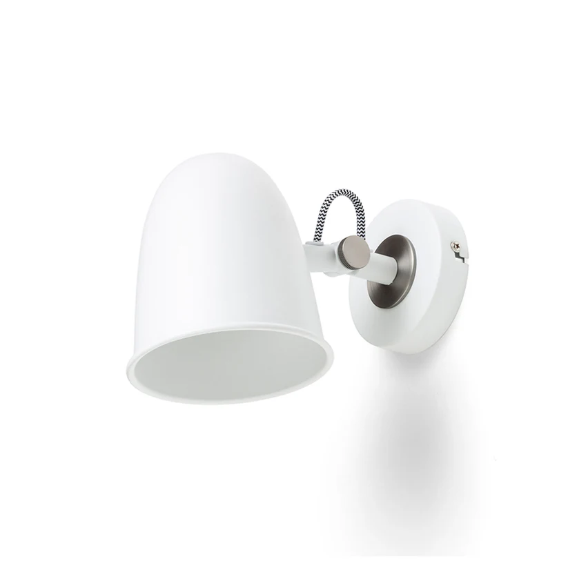 Aplica de perete metalică cu reflector basculant pentru surse LED cu soclu E14. Comutatorul este situat pe spatele umbririi.