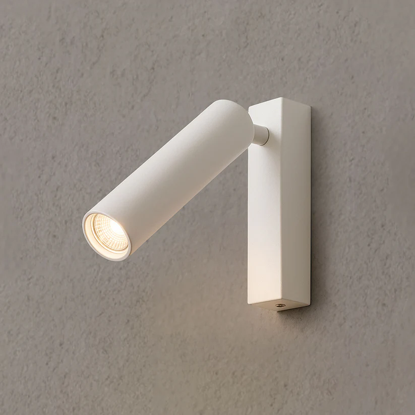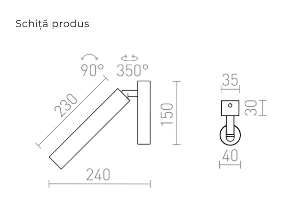 Spot LED tubular, montat la suprafață pe bază unghiulară, pentru iluminare punctuală și direcțională.