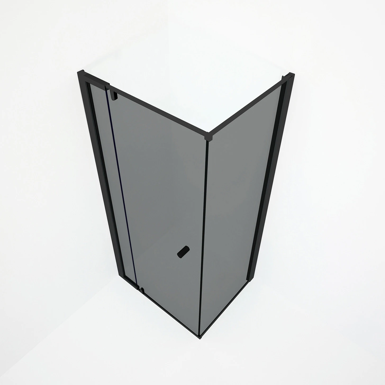 Modelul este prevăzut cu profil din inox cu finisaj negru, două panouri fixe și o ușă realizate din sticlă securizată fumurie de 6 mm grosime, oferind siguranță și durabilitate în utilizare. Cabina are formă pătrată, unul dintre pereții laterali având 90 cm, iar peretele cu ușă dispune de un interval de ajustare între 84 și 90 cm, facilitând adaptarea la spațiul existent.