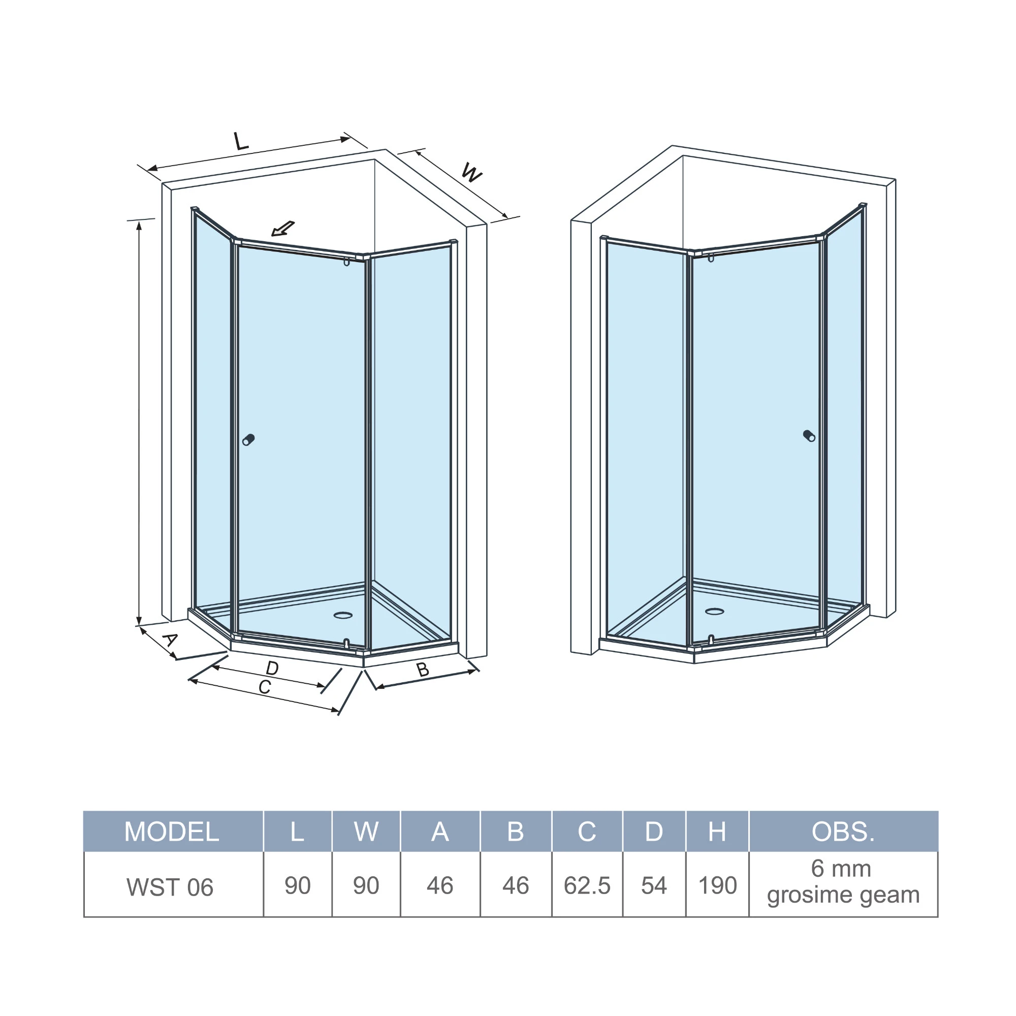 Cabina de duș WST06 este o alegere modernă, economică și practică pentru amenajarea spațiului sanitar. Datorită dimensiunilor reduse, se integrează cu ușurință în orice tip de baie, fiind ideală atât pentru spații compacte, cât și pentru băi minimaliste.