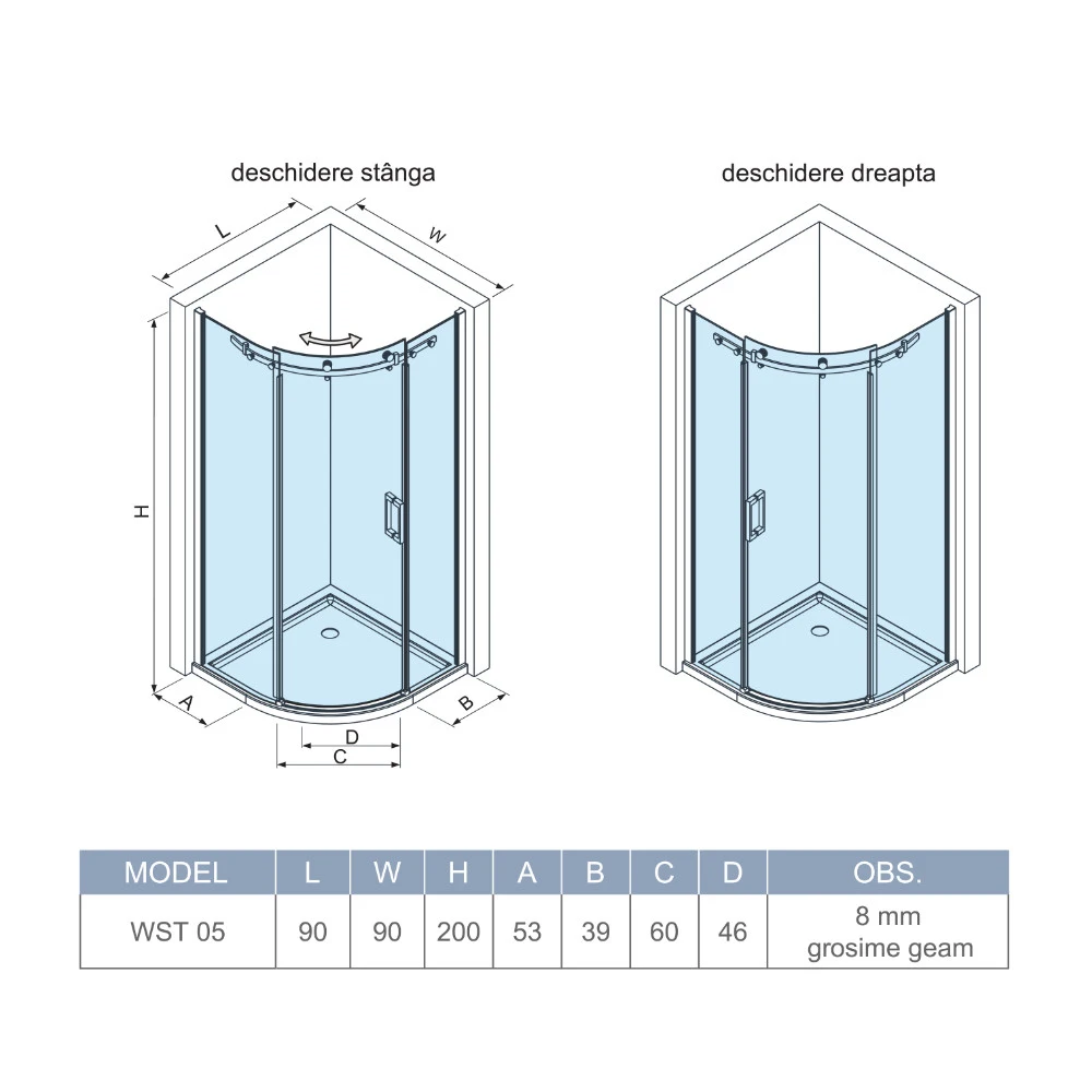 Cabina se amplasează în colțul încăperii și are dimensiunile 90 × 90 cm, cu o înălțime de 200 cm, ceea ce o face ideală pentru spațiile sanitare care nu permit instalarea unei căzi, oferind în același timp un acces facil și confort sporit.