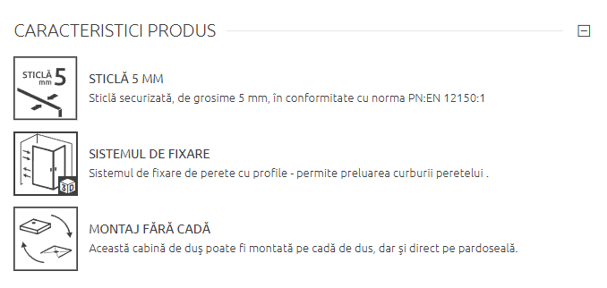 Realizată din sticlă securizată de 6 mm, cabina oferă siguranță și rezistență în utilizarea zilnică. Profilul metalic cu finisaj cromat asigură stabilitate și completează designul modern al produsului.