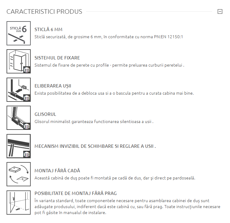 Realizată din sticlă securizată de înaltă calitate, cabina oferă durabilitate și siguranță în utilizare zilnică. Profilul metalic cu finisaj Brushed Gold completează armonios designul premium și conferă stabilitate și rezistență în timp.