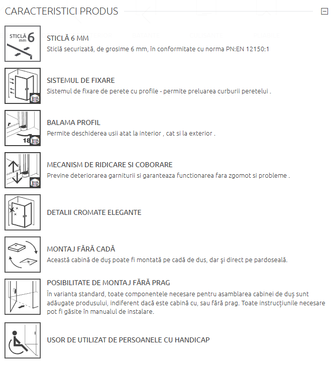 Realizată din sticlă securizată de înaltă calitate, cabina asigură durabilitate și siguranță în utilizare zilnică. Profilul metalic cromat completează designul premium și oferă stabilitate pe termen lung.